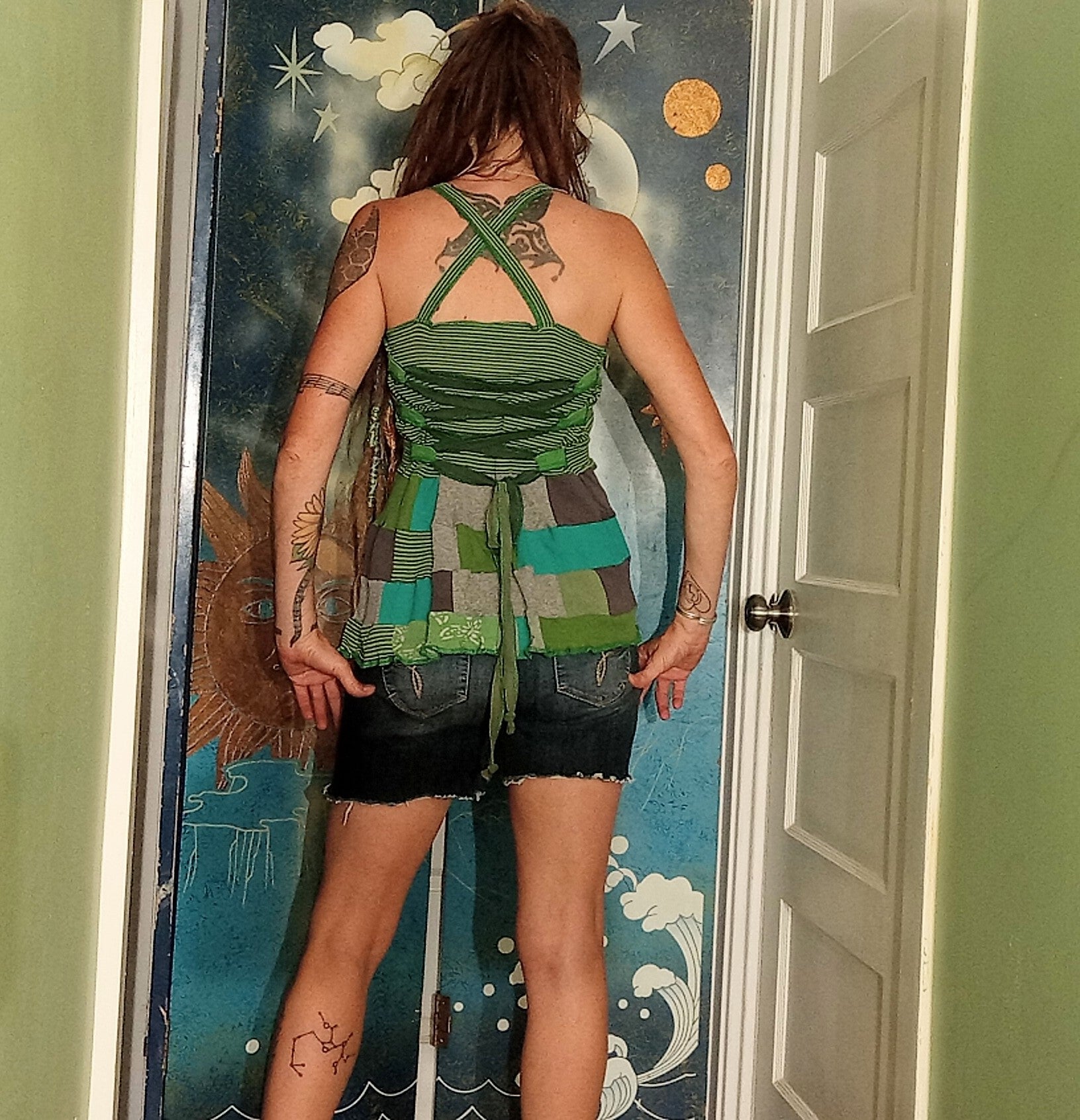 One of a kind handmade Patchwork top with closed lace up back created by me, tiphzthreads! beautifully pieced together using a collection of organic cotton greens. straps criss cross in back. lace up straps for adjustability along a closed back. nice soft stretchy comfortable jerseys and ribbed fabrics. coastal forest top is shown in photo three with the coastal forest skirt which can be purchased seperately until no longer available, if you are interested in the full set. handmade with love and care and built to last. Please wash in cold water on most delicate cycle and hang dry for longest lasting livity. thankyou and enjoy!